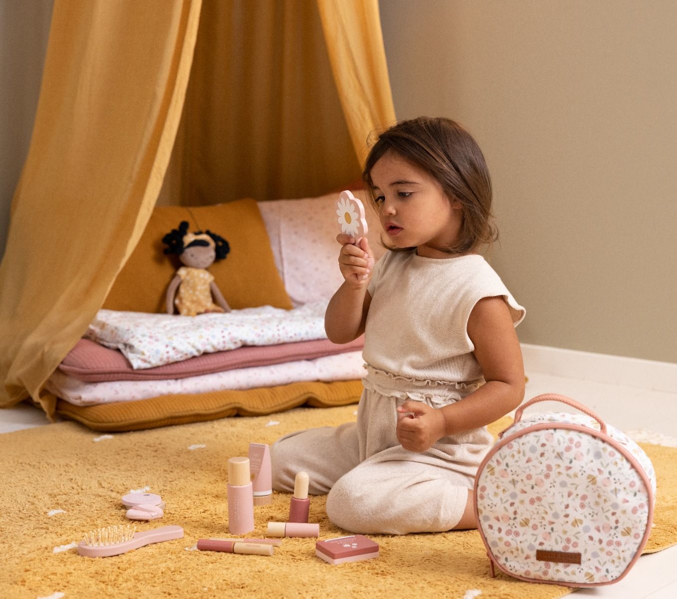 Just like mom. Kids learn by imitating. Inspire imaginative play with this blooming beauty case. Enhanced with a vivid floral pattern, it comes with 10 different pretend play wooden beauty products. There’s a hand-held mirror, a perfume bottle and a tube of cream. The set also consists of lipstick, nail polish, face powder, powder puff, eye shadow, mascara and a nail file. This Little Dutch beauty case allows all the fun, but not the mess of real make-up! Designed for ages 3 and up.