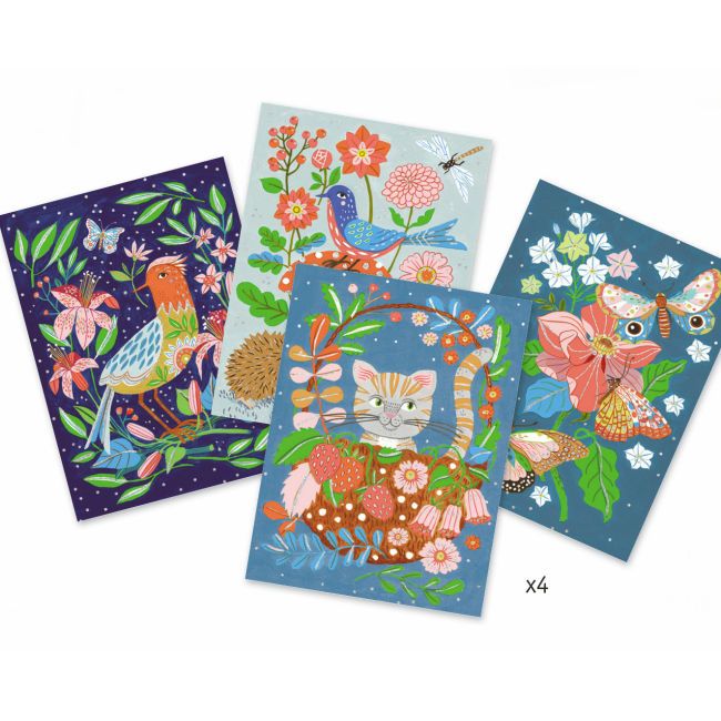 Colour in the 4 pictures with the felt brushes and illuminate with a glitter marker, following the artist’s designs.