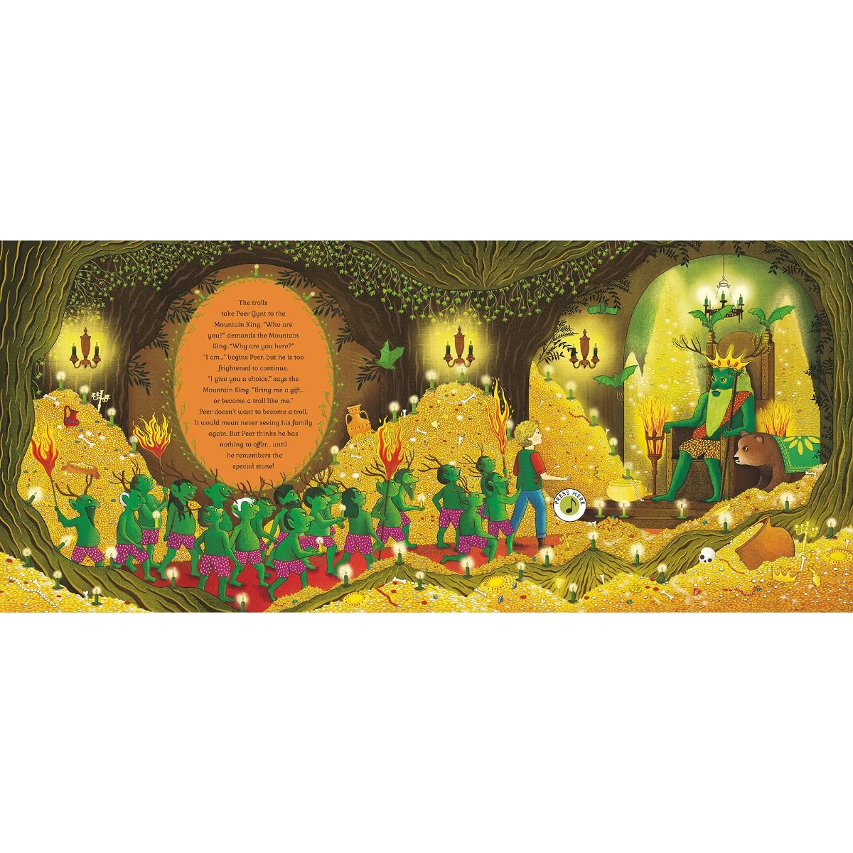 Discover the spellbinding magic of The Mountain King in this musical retelling of Peer Gynt – push the button on each beautiful scene to hear the vivid sound of an orchestra playing from Grieg’s score.