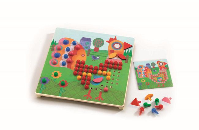 Place the coloured pegs into the holes to create fun pictures. Contains a wooden board, 8 picture cards and 170 coloured pegs.