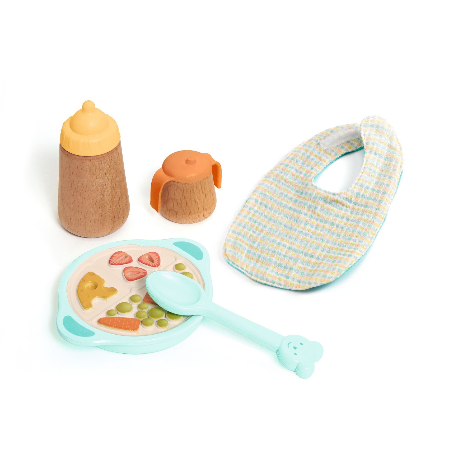 Little tummies are rumbling—let’s dig in! This adorable lunch break box is packed with all the must-haves for feeding hungry dolls big and small. Inside, you’ll find a sectioned plate (perfect for picky eaters!), a spoon, a sippy cup, a bottle, and even a bib for those "oops!" moments. On today’s menu: yummy peas, crunchy carrots, tasty cheese chunks, and sweet strawberries for dessert. Bon appétit, baby!