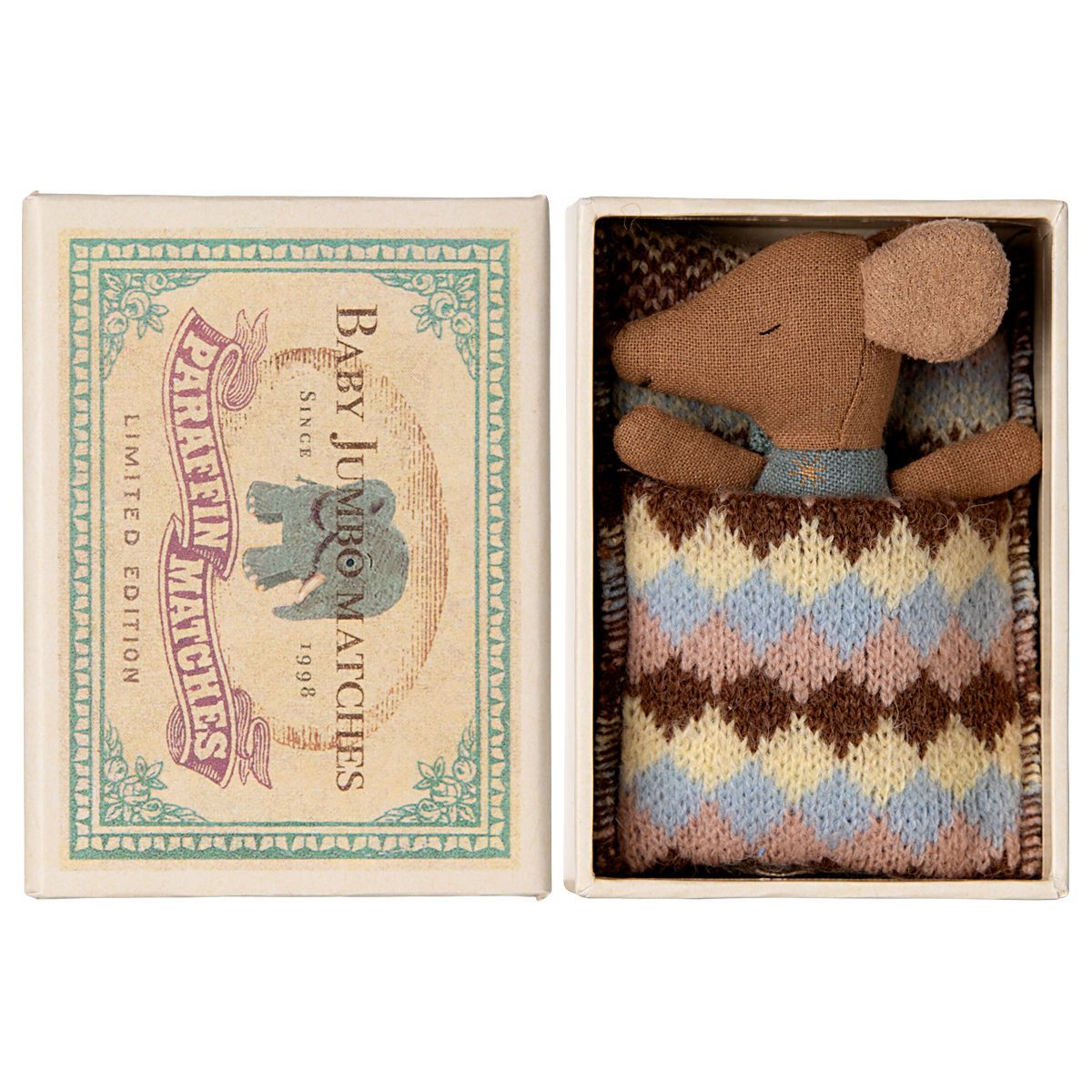 A classic Maileg item. This mouse is ready for hours of play and sleeps tight in the little matchbox. The clothes and bedlinen are made of soft fabrics with unique prints in beautiful colors.