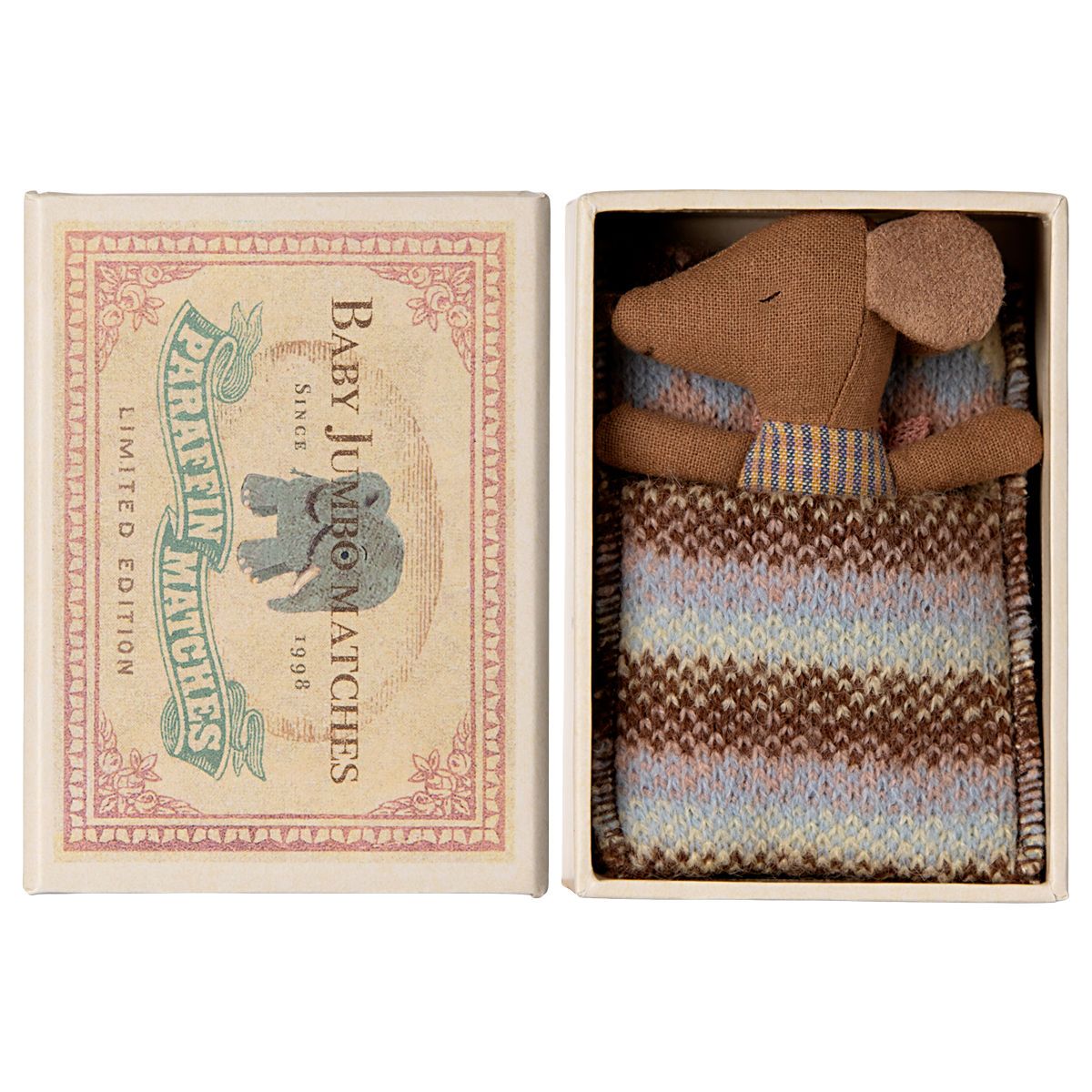 A classic Maileg item. This mouse is ready for hours of play and sleeps tight in the little matchbox. The clothes and bedlinen are made of soft fabrics with unique prints in beautiful colors.