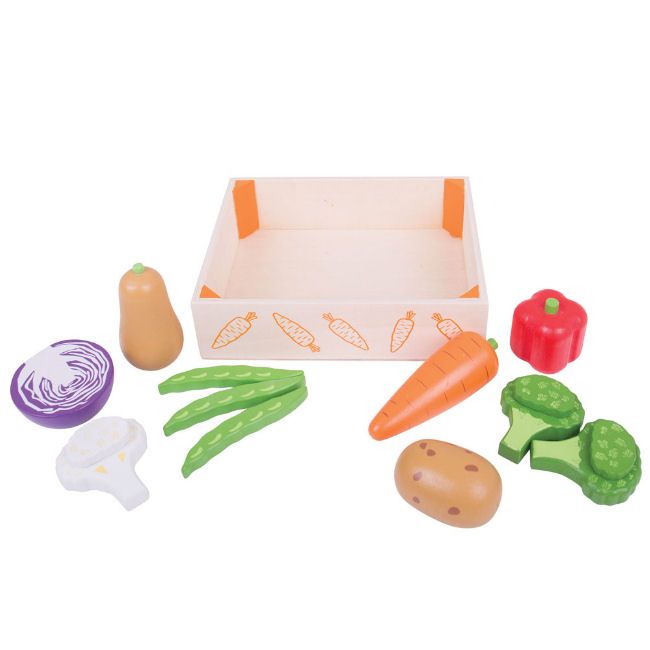 This Crate includes contains brightly coloured wooden play food items that can be used to create a delicious meal or be sold in the Bigjigs Toys Village Shop (BJ354)!